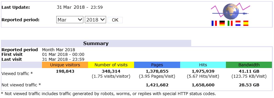 O quadro abaixo mostra o fluxo de visitantes (leitores) registado no servidor no mês de março de 2018, bem como o volume de páginas abertas, o download, etc. precisamente quando se completou um ano após o lançamento da nova plataforma de informação - jornal diariOnline Região Sul sob o domínio Certificado https://regiao-sul.pt